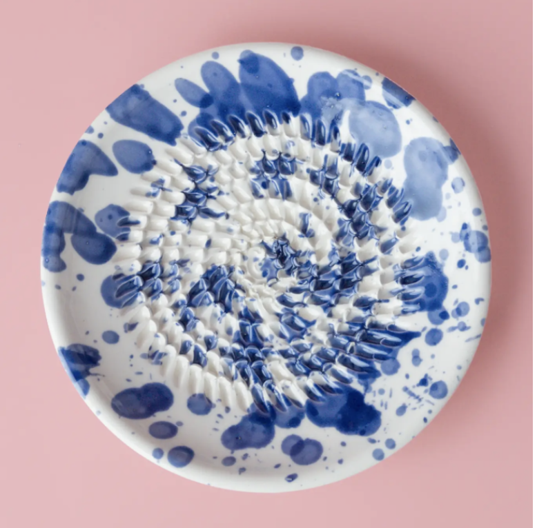 En liten tallrik som har ett riv på mitten för vitlöken eller parmesan, lök eller ja vad vet jag.